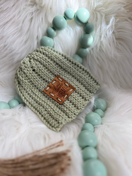 Moss Green Infant patch "Little Miracle" beanie 0-3 mo
